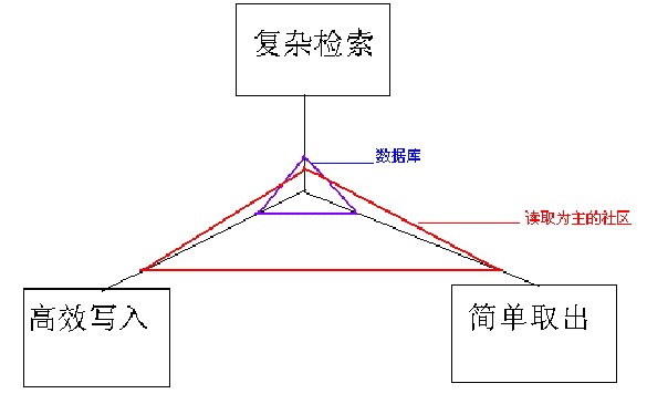 我们可以看出需要数据库关联,排序的能力,这个能力在某些情况下非常重要,但是如果你的网站的常规操作,全是这样复杂的逻辑,那效率一定是非常低 的,所以我们常常在数据库里加入许多冗余字段,来减小简单查询时关联等操作带来的压力,我们看看下面这张图,可以看到数据库的设计重心,和网站(指内容型 社区)需要面对的问题实际是有一些偏差的。