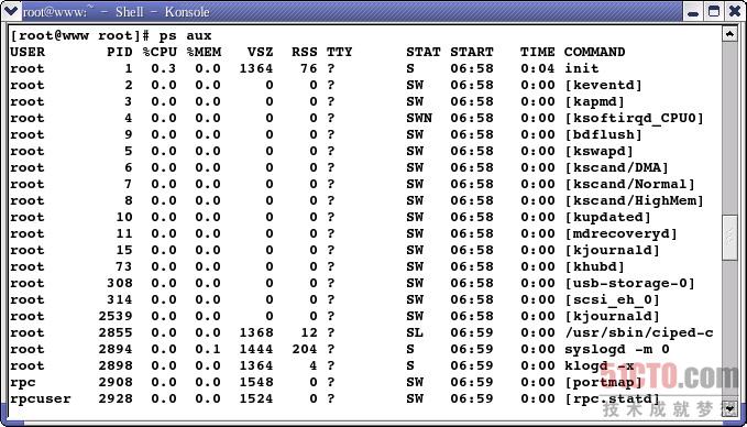 说明:要对进程进行监测和控制,首先要了解当前进程的情况,也就是需要查看当前进程。ps命令就是最基本、也是非常强大的进程查看命令。根据显示的信息可以确定哪个进程正在运行、哪个进程被挂起、进程已运行了多久、进程正在使用的资源、进程的相对优先级,以及进程的标志号(PID)。所有这些信息对用户都很有用,对于系统管理员来说更为重要。使用"ps -aux"命令可以获得终端上所有用户的有关进程的所有信息,下面结合图讲解进程的基本信息。