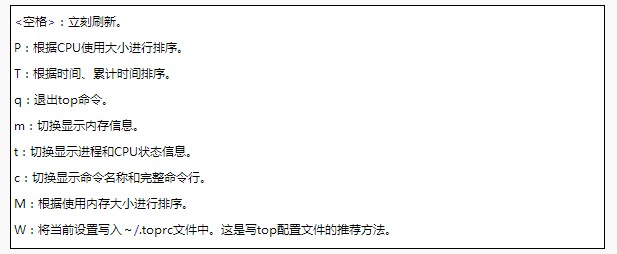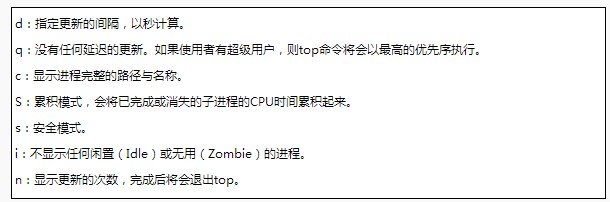 PID(Process ID):进程标志号,是非零正整数。USER:进程所有者的用户名。PR:进程的优先级别。NI:进程的优先级别数值。VIRT:进程占用的虚拟内存值。RES:进程占用的物理内存值。SHR:进程使用的共享内存值。STAT:进程的状态,其中S表示休眠,R表示正在运行,Z表示僵死状态,N表示该进程优先值是负数。%CPU:该进程占用的CPU使用率。%MEM:该进程占用的物理内存和总内存的百分比。TIME:该进程启动后占用的总的CPU时间。COMMAND:进程启动的启动命令名称,如果这一行显示不下,进程会有一个完整的命令行。top命令使用过程中,还可以使用一些交互的命令来完成其他参数的功能。这些命令是通过快捷键启动的。
