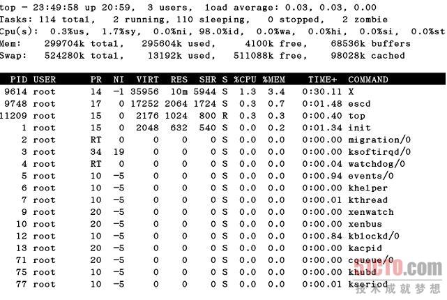在图中,第一行表示的项目依次为当前时间、系统启动时间、当前系统登录用户数目、平均负载。第二行显示的是所有启动的、目前运行的、挂起(Sleeping)的和无用(Zombie)的进程。第三行显示的是目前CPU的使用情况,包括系统占用的比例、用户使用比例、闲置(Idle)比例。第四行显示物理内存的使用情况,包括总的可以使用的内存、已用内存、空闲内存、缓冲区占用的内存。第五行显示交换分区的使用情况,包括总的交换分区、使用的、空闲的和用于高速缓存的交换分区。第六行显示的项目最多,下面列出了详细解释。