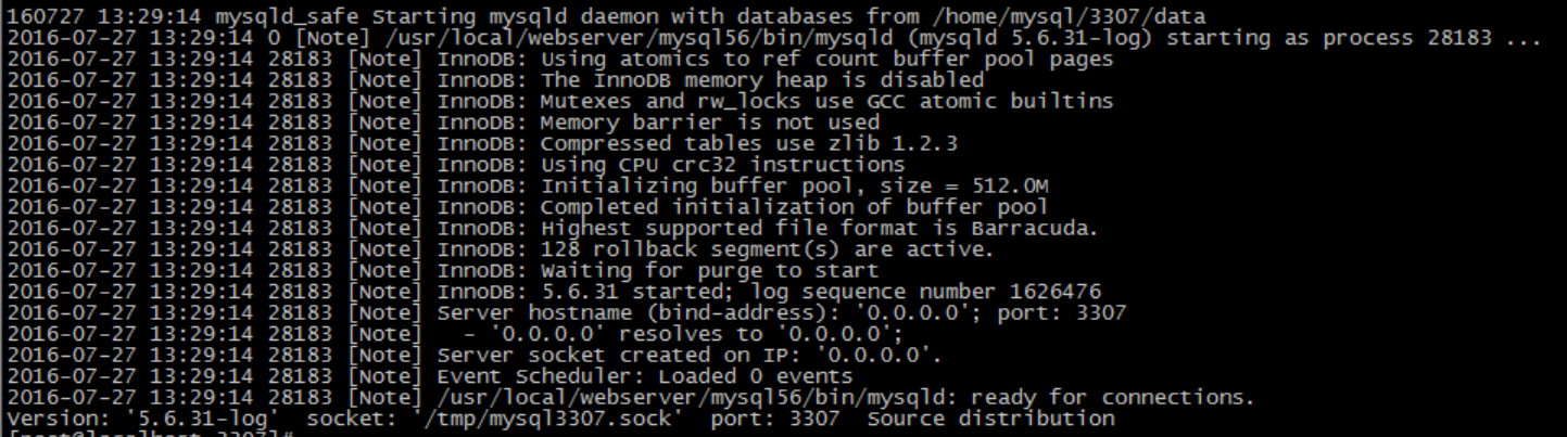 2016-07-27 12:52:33 26248 [Note] /usr/local/webserver/mysql56/bin/mysqld: ready for connections.