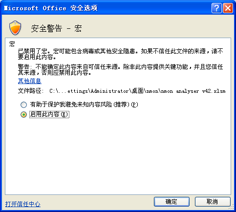 当前最新版为4.2,文件很小,就200多K,下载后解压会有一个nmon analyser v42.xlsm文件,我们双击打开这个文件,在左上角的地方会有一个安全警告,提示宏已被禁用,这里使用的offices 2007,其他版本不清楚是否一样,