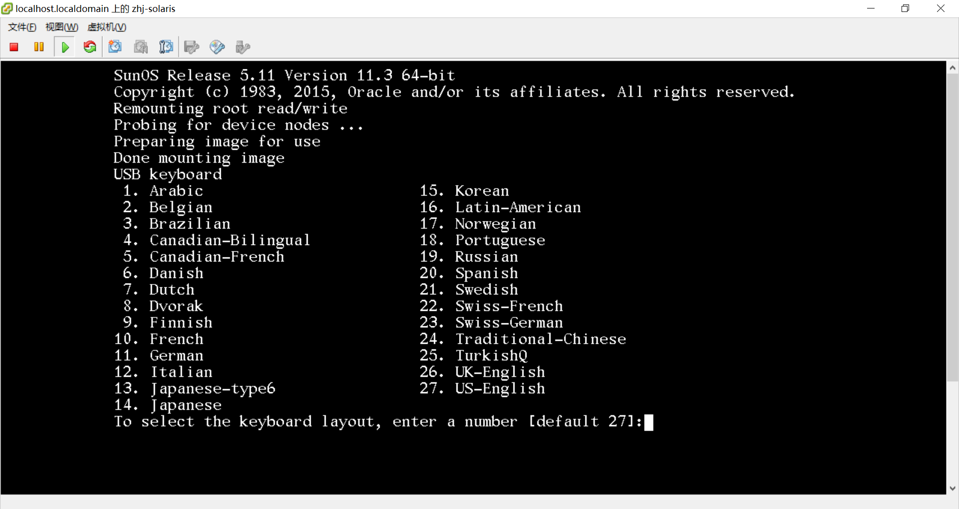 演示使用的是当前最新文本安装版本:http://download.oracle.com/otn/solaris/11_3/sol-11_3-text-x86.iso