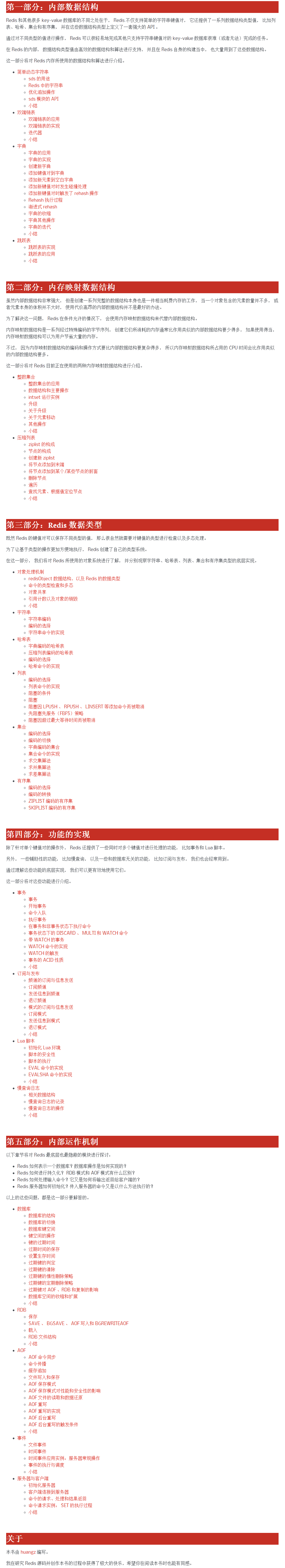本书的目标是以简明易懂的方式讲解 Redis 的内部运行机制,通过阅读本书,你可以了解到 Redis 从数据结构到服务器构造在内的几乎所有知识。
