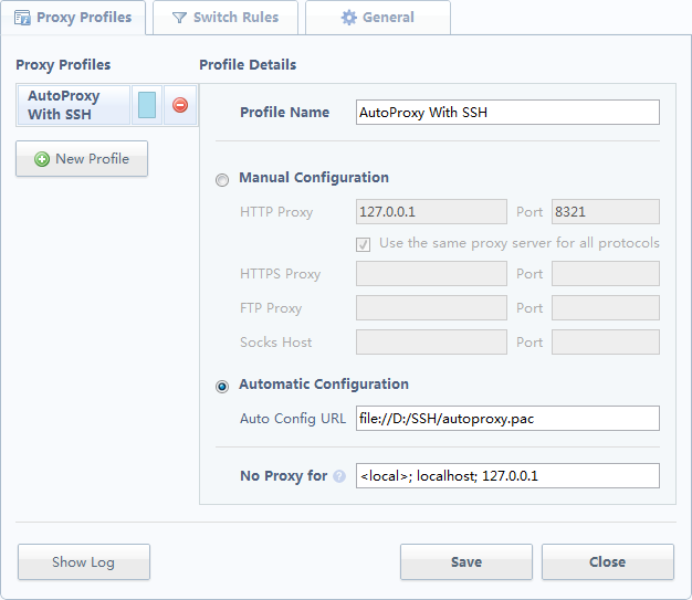 做完上面这些,Chrome是能翻Wall了,不过却不能像用AutoProxy那样智能,好在Chrome的Proxy Switchy!插件在几次升级之后,已经能在切换代理的同时,配置PAC文件了,不用总是开 IE的代理选项去设置了~[现在Proxy Switchy!已经可以用Socks5代理了,不过这样会导致用不了PAC]