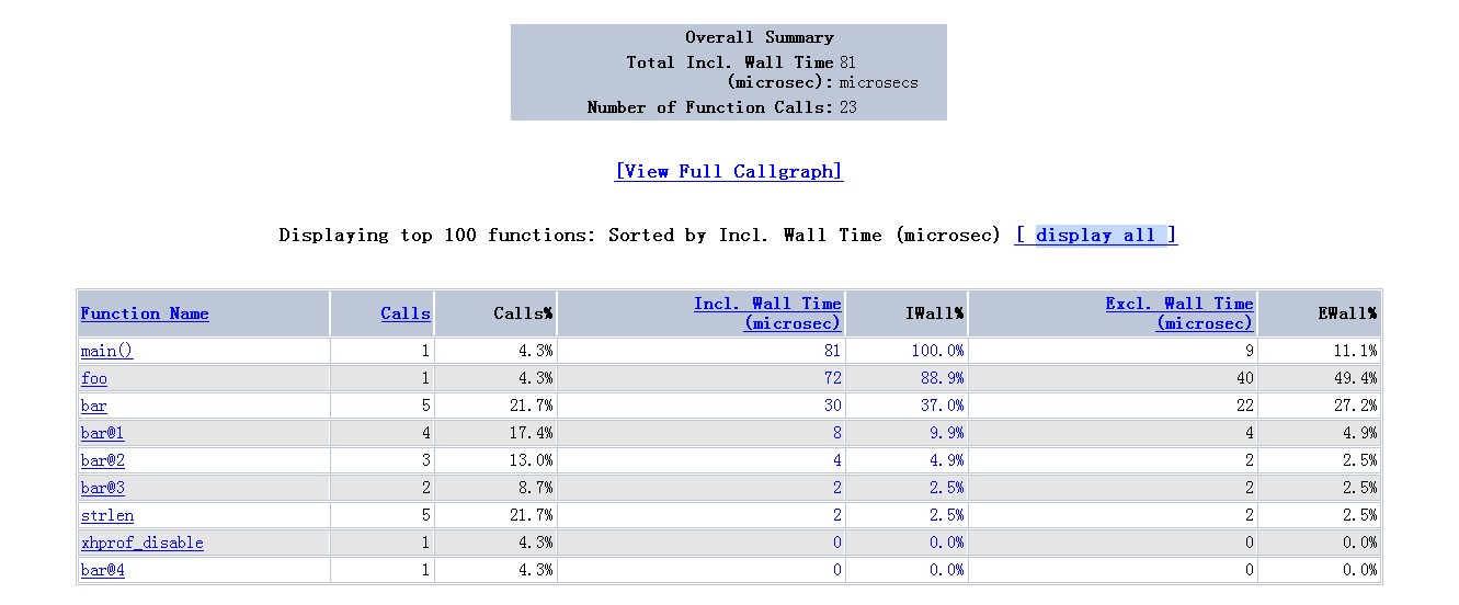 如果你点击:[View Full Callgraph]出现failed to execute cmd " dot -Tpng"的错误,可能是你的php.ini配置中disable_functions那里禁用了proc_open函数,修改php.ini配置文件去掉这个限制就可以图形展示了,感兴趣的朋友可以自己配置一个玩玩。